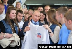 Президент России посетил свой предвыборный штаб и встретился с волонтерами, которые подарили ему толстовку с символикой кампании. Путин сказал, что носить ее не будет. Коротка кольчужка-то.