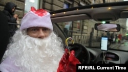 Рядом с дедом – Снегурочка. Водители проезжающих мимо машин сигналят, а на светофоре водитель троллейбуса не обращает внимания на переключившийся зеленый сигнал и, как завороженный, достает мобильный телефон – снимает удивительный транспорт.