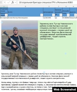 В базе упоминаются и военные, о которых писали СМИ: например, уроженец Новолакского района Дагестана Мухтар Алиев, который, как сообщало в декабре 2022 года издание "Голос времени", попал под обстрел и сумел спастись. База ГВМУ позволяет узнать, что он был ранен месяцем ранее, в середине ноября и был госпитализирован с диагнозом "закрытый перелом костей носа" в 419-й военный госпиталь в Краснодаре. Из базы данных следует, что Алиев, как и еще более ста человек, информация о которых есть в документе, служил в военной разведке, в 10-й отдельной бригаде спецназа ГРУ, дислоцированной на хуторе Молькино Краснодарского края.