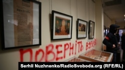Стены внутри здания они разрисовали надписями "Верните заключенных" (речь идет о находящихся в российских тюрьмах украинцах), "Смерть сепарам", "Это вам за Крым" и другими.